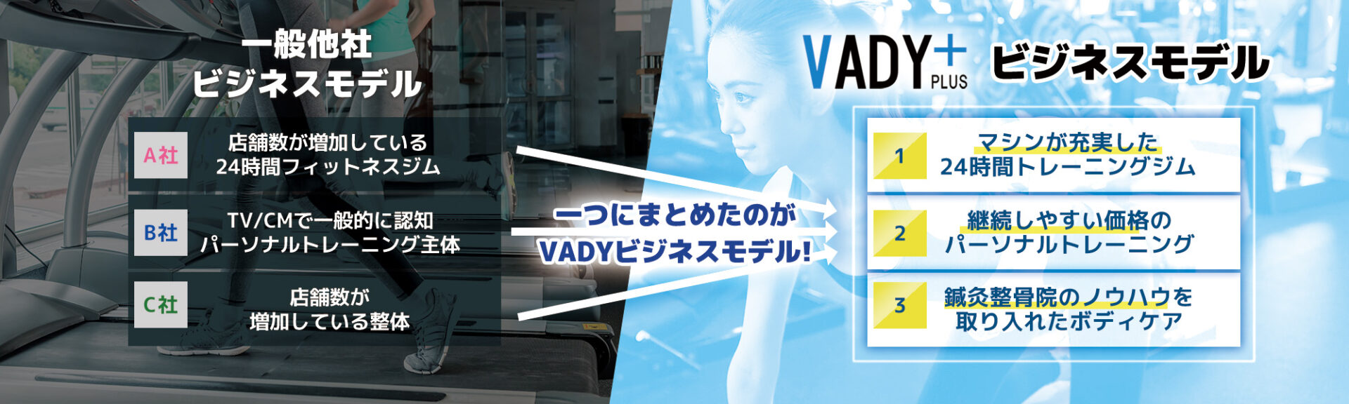 ・VADYのビジネスモデルは、マシンを充実させたフリートレーニングとパーソナルトレーニングとボディケアが1つになった独自の事業モデルです。