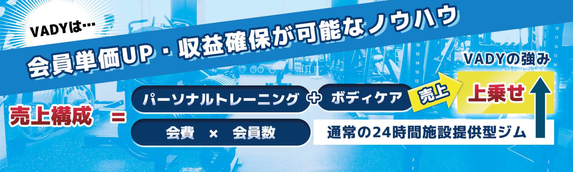 マシンが充実した「フリートレーニングジム」、継続しやすい価格での「パーソナルトレーニング」、鍼灸接骨院のノウハウを活かした「ボディケア」がひとつになったVADY独自のビジネスモデルが人気の理由のひとつです。
